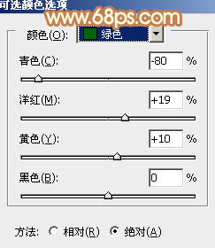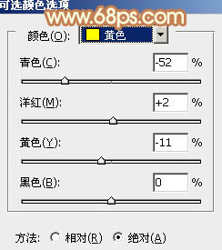 2、创建可选颜色调整图层,对黄、绿、白、黑进行调整,参数设置如图7 - 10,效果如图11。这一步给背景部分增加黄褐色。