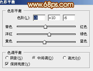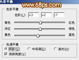 8、创建色彩平衡调整图层,对阴影、中间调、高光进行调整,参数设置如图27 - 29,效果如图30。这一步加强图片暗部及高光部分的颜色。
