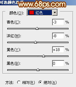 10、创建可选颜色调整图层,对红、黄、绿进行调整,参数设置如图32 - 34,效果如图35。这一步给图片增加暖色。