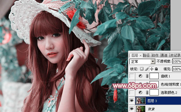 3、创建色相/饱和度调整图层,对青色进行调整,参数及效果如下图。这一步把图片中的青色转为红色。