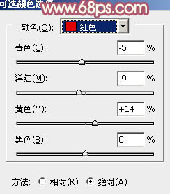 2、创建可选颜色调整图层,对红色进行调整,参数及效果如下图。这一步把图片中的红色转为橙红色。