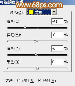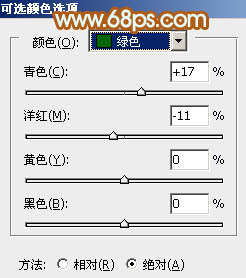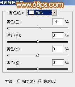 3、创建可选颜色调整图层,对红、黄、绿、白进行调整,参数设置如图11 - 14,确定后把图层不透明度改为:50%,效果如图15。这一步给图片增加橙黄色。
