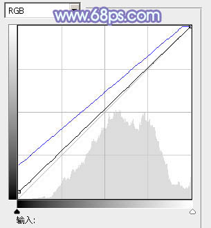2、创建曲线调整图层,对RGB,蓝通道进行调整,参数及效果如下图。这一步适当增加图片暗部亮度,同时给暗部增加蓝色。