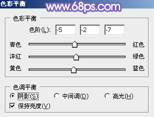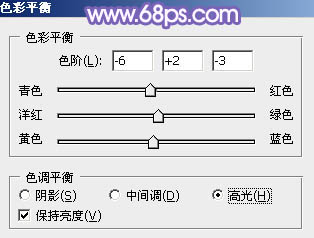 7、创建色彩平衡调整图层,对阴影,高光进行调整,参数设置如图14,15,效果如图16。这一步微调图片暗部及高光部分的颜色。