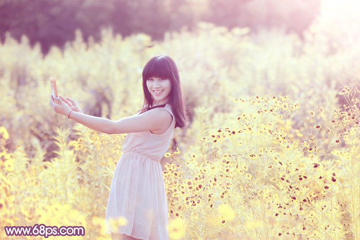 素材图片中暖色也比较多,调色的时候只需要把整体稍微调亮,背景中的黄绿色都转为淡黄色,然后给暗部增加一点蓝紫色,再把人物肤色调亮即可。