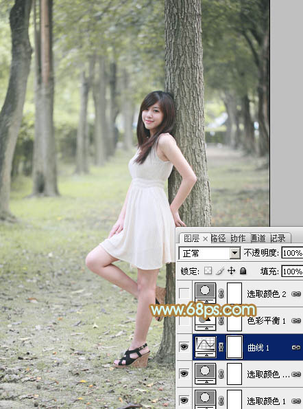Photoshop给树林美女加上淡淡的黄绿色