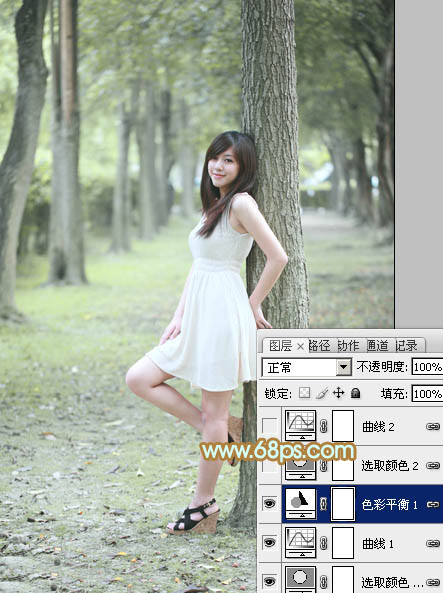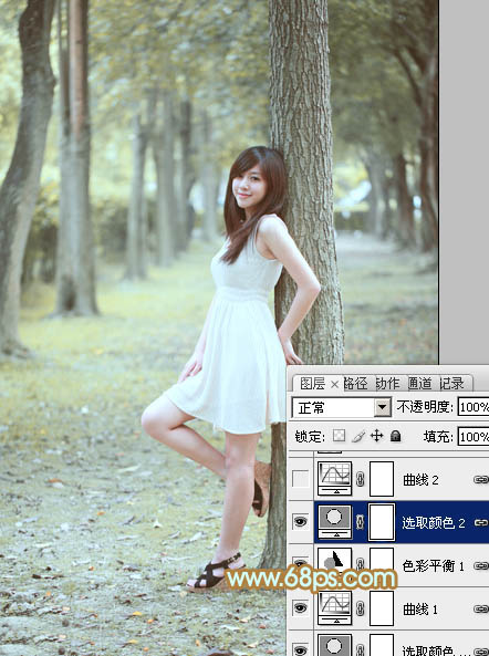 Photoshop给树林美女加上淡淡的黄绿色