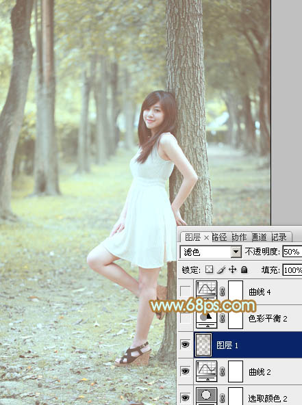 Photoshop给树林美女加上淡淡的黄绿色