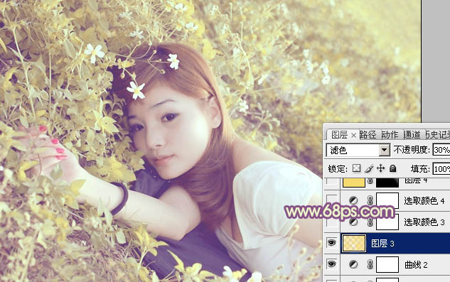 8、按Ctrl + Alt + 2调出高光选区,新建一个图层填充橙黄色:#F5DB6F,混合模式改为“滤色”,不透明度改为:30%,效果如下图。这一步适当增加图片高光部分的亮度。