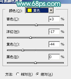 2、创建可选颜色调整图层,对黄色进行调整,参数设置如图4,效果如图5。这一步把图片中的黄色转为青绿色。