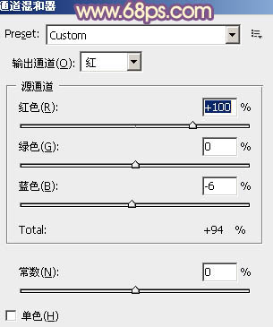 4、创建通道混合器调整图层,对红色通道进行调整,参数及效果如下图。这一步适当减少图片中的红色。