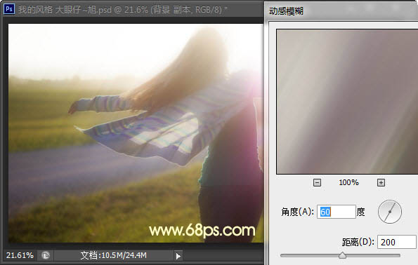 1、打开原照,按CTRL+J复制一层,执行,滤镜-模糊-动感模糊-数值如图。并设置图层的不透明度为50%,这样我们先为其制作朦胧的效果。