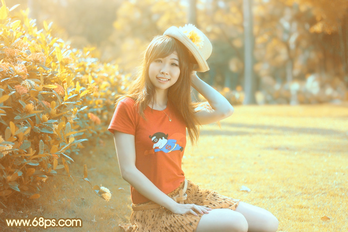 素材图片有点逆光,人物部分有点偏暗,背景部分有点脏。处理的时候可以先把图片暗部增亮,颜色转为统一的暖色,再把背景部分适当模糊处理即可。