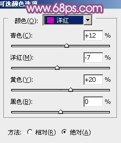 3、创建可选颜色调整图层,对黄、蓝、洋红、白、中性、黑进行调整,参数设置如图6 - 11,效果如图12。这一步给图片增加橙黄色。