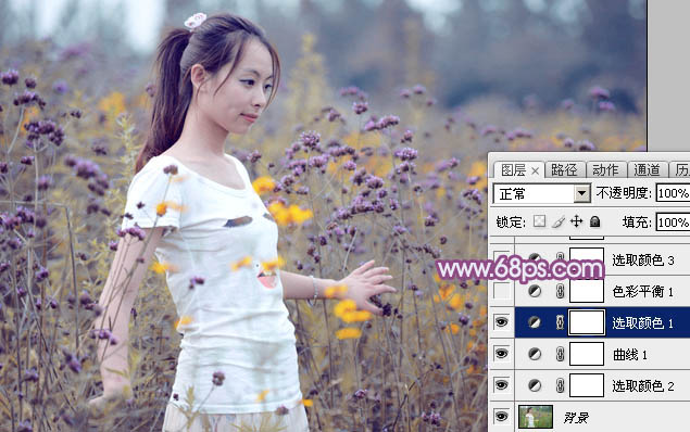 Photoshop给野花中的美女加上柔美的淡紫色