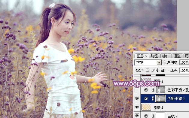Photoshop给野花中的美女加上柔美的淡紫色