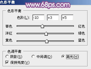 7、创建色彩平衡调整图层,对阴影,高光进行调整,参数设置如图21,22,效果如图23。这一步主要加强图片高光部分的颜色。