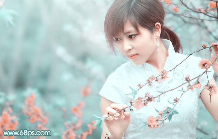 素材图片本身也是古典题材,只是画面的色彩有点杂。调色的时候可以先用通道替换消除一些杂色,然后选择一种比较合适的淡青色作为主色,再整体柔化处理即可。