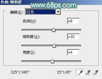 5、创建色相/饱和度调整图层,对红色进行调整,参数及效果如下图。这一步把图片中的红色调淡。