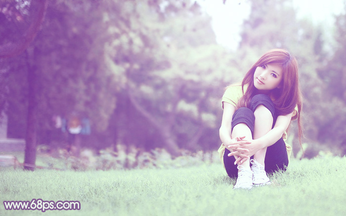 素材图片颜色比较少,以绿色为主,转为绿紫色是非常快的。先把图片整体调亮,暗部多增加一些蓝紫色,再把绿色部分稍微调淡即可。
