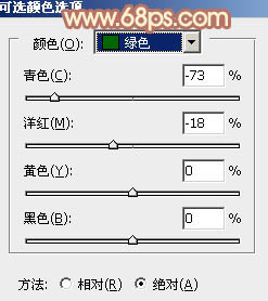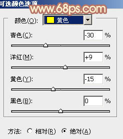 2、创建可选颜色调整图层,对黄,绿进行调整,参数设置如图3,4,效果如图5。这一步把草地黄绿色转为橙黄色。
