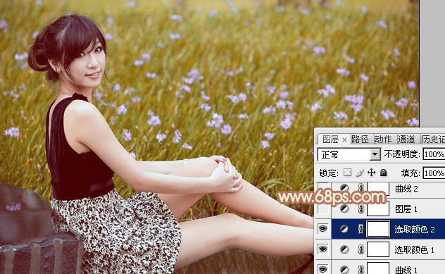 Photoshop给草地上的美女加上柔和的淡调橙褐色