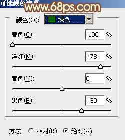 1、打开素材图片,创建可选颜色调整图层,对绿色进行调整,参数设置如图1,效果如图2。这一步把图片中的绿色转为黄褐色。