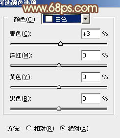 2、创建可选颜色调整图层,对黄,白进行调整,参数设置如图3,4,效果如图5。这一步把图片的主色转为橙黄色。