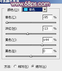 3、创建可选颜色调整图层,对绿、青、白进行调整,参数设置如图7 - 9,效果如图10。这一步给草地增加黄绿色,天空部分增加青绿色。