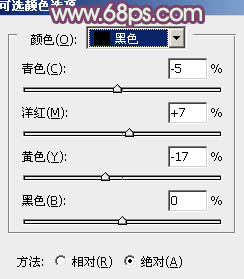 6、创建可选颜色调整图层,对红、黄、黑进行调整,参数设置如图14 - 16,效果如图17。这一步把草地颜色转为橙黄色,天空部分增加淡青色。