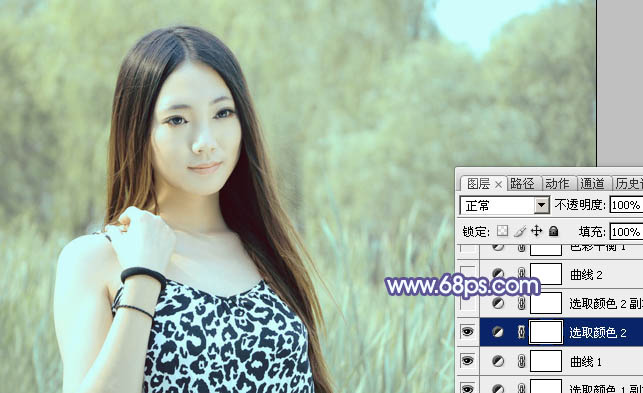 Photoshop给绿树边的美女加上淡美的蓝黄色(4)