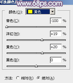 1、打开素材图片,创建可选颜色调整图层,对黄色进行调整,参数及效果如下图。这一步给图片增加暖色。