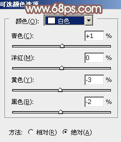 6、创建可选颜色调整图层,对红,白进行调整,参数设置如图14,15,效果如图16。这一步微调人物肤色及高光部分的颜色。