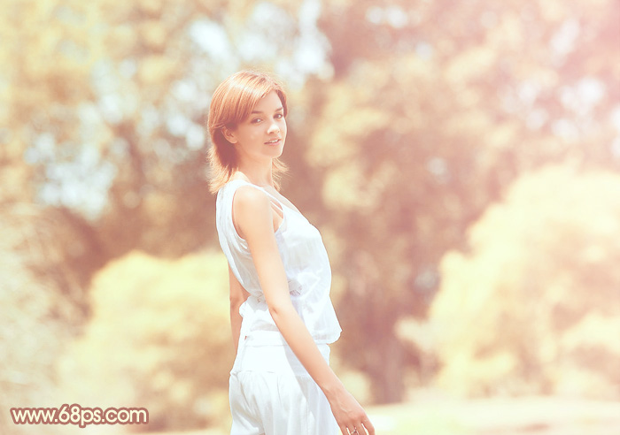 素材图片主色以黄绿色为主,转为黄褐色是非常简单的。把黄绿色转为橙黄色并调淡,暗部增加一些红褐色,再柔化处理即可。