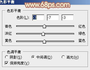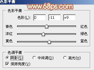 5、创建色彩平衡调整图层,对阴影、中间调、高光进行调整,参数设置如图13 - 15,效果如图16。这一步加强图片高光及暗部颜色。