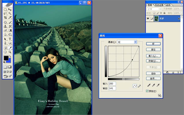 2、打开曲线选择红色通道压红,使照片发暗、发青色、发透,有效的减去了照片中整体的红色,这种减红的方法快捷方便。