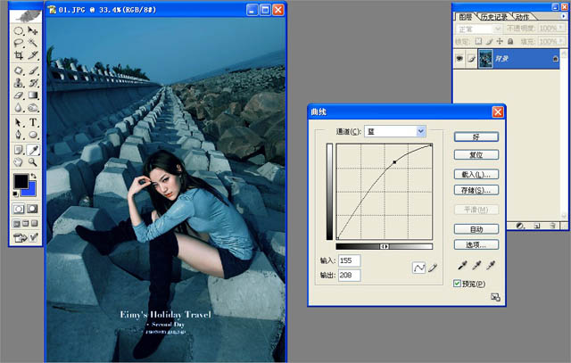 3、为了使人物更更清澈,曲线选择蓝色通道提篮,增强透度,这种提篮的方法,是整体平面提篮,让照片更透彻。