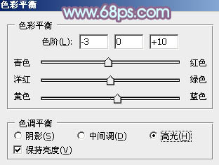 7、创建色彩平衡调整图层,对阴影、中间调、高光进行调整,参数设置如图21 - 23,效果如图24。这一步给图片高光部分增加淡蓝色。