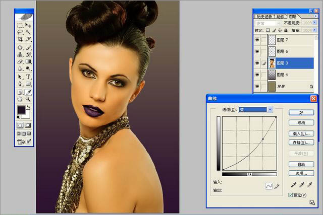 14、为了营造复古的效果,我们选择复古常用的暗黄基调,执行曲线压蓝,添加复古感觉。