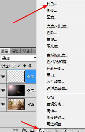6、点击图层面板下方的“创建新的填充或调整图层”按钮,选择“纯色”,如下所示。
