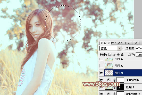 9、用椭圆选框工具拉出下图所示的椭圆选区,羽化50个像素后填充暗褐色:#A4786E,混合模式改为“滤色”,不透明度改为:60%,效果如下图。这一步简单给图片增加高光。