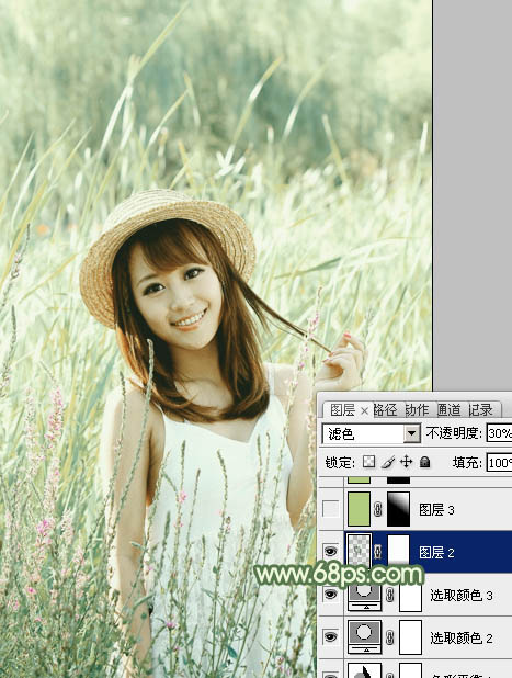 7、按Ctrl + Alt + 2 调出高光选区,按Ctrl + Shift + I 反选,新建一个图层填充暗绿色:#60795A,混合模式改为“滤色”,不透明度改为:30%,效果如下图。这一步增加图片暗部亮度。