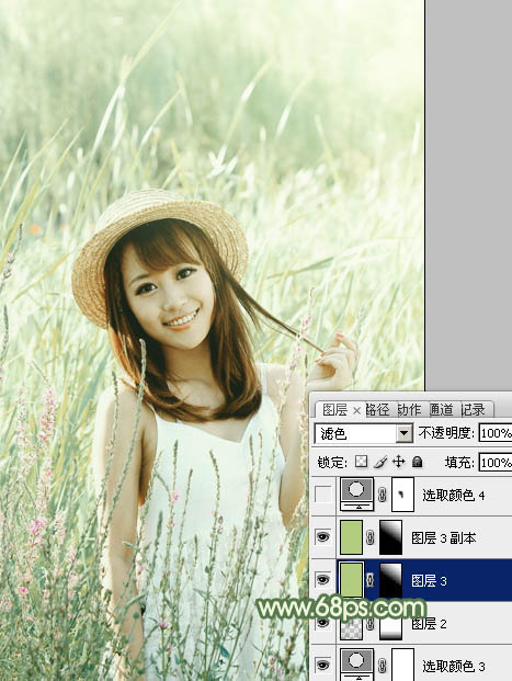 8、新建一个图层填充绿色:#B2CD7E,混合模式改为“滤色”,按住Alt键添加图层蒙版,用白色画笔把右上角部分擦出来,效果如下图。这一步给图片增加高光。