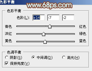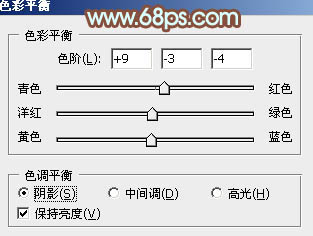 8、创建色彩平衡调整图层,对阴影、中间调、高光进行调整,参数设置如下图,确定后把蒙版填充黑色,用白色画笔把人物脸部及肤色部分擦出来,效果如图34。这一步给人物肤色部分增加黄褐色。