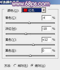 5、创建可选颜色调整图层,对红、黄、绿进行调整,参数设置如图14 - 16,效果如图17。这一步主要给图片高光部分增加一些暖色。