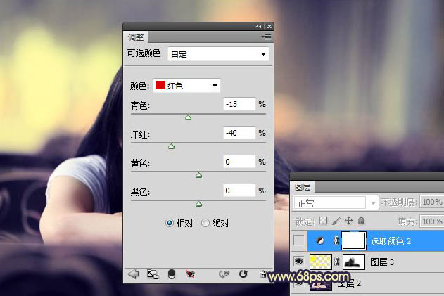 6、创建可选颜色调整图层,分别调整红/黄/蓝通道,参数如图,效果如图。