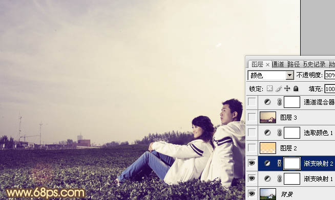 2、再创建渐变映射调整图层,颜色设置如图3,确定后把图层混合模式改为“颜色”,不透明度改为:30%,效果如图4。