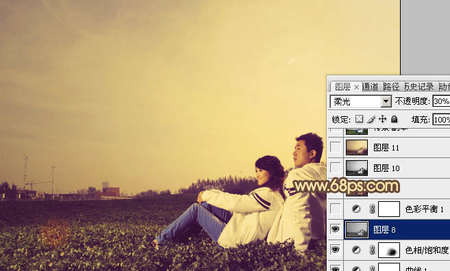 12、新建一个图层,盖印图层。按Ctrl + Shift + U 去色,混合模式改为“柔光”,不透明度改为:30%,效果如下图。