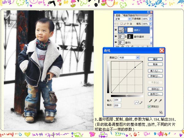 第9步:盖印图层,复制,曲线,参数为输入194,输出208.(目的就是调整图片的整体感觉,当然,不同的片片可能会不一样的参数)