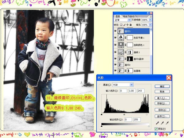 第10步:继续盖印,Ctrl+L,色阶,输入色阶0,1.00,243